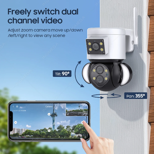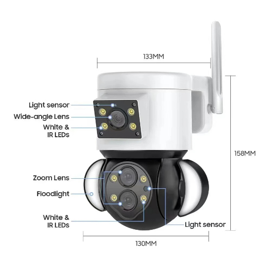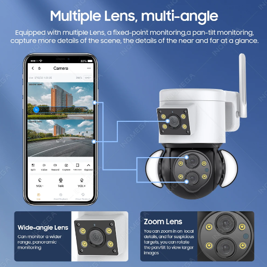 - Multiple lens, multi-angel. Equipped with multiple lens, a fixed-point monitoring, a pan-tilt monitoring, capture more detail of the scene, the details of the near and far at a glance