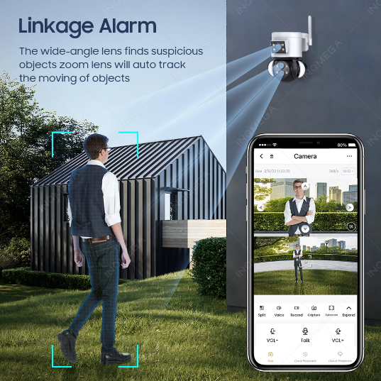 - Linkage alarm. The wild angle lens finds suspicious object and zoom lens will auto track the moving objects