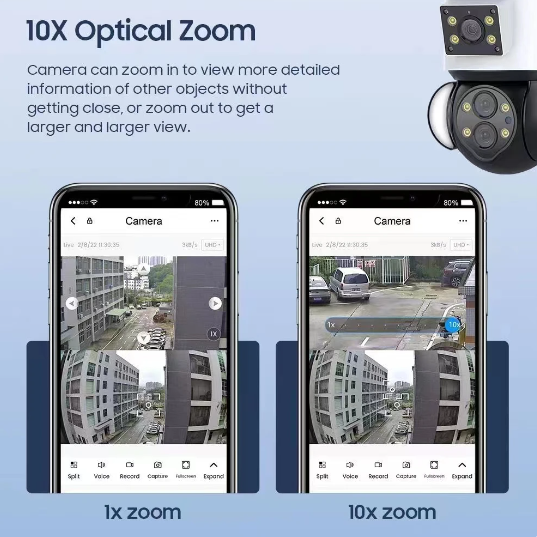 - 10 x optical zoom. Camera can zoom to view more detailed information of other object, or zoom out to get a larger view